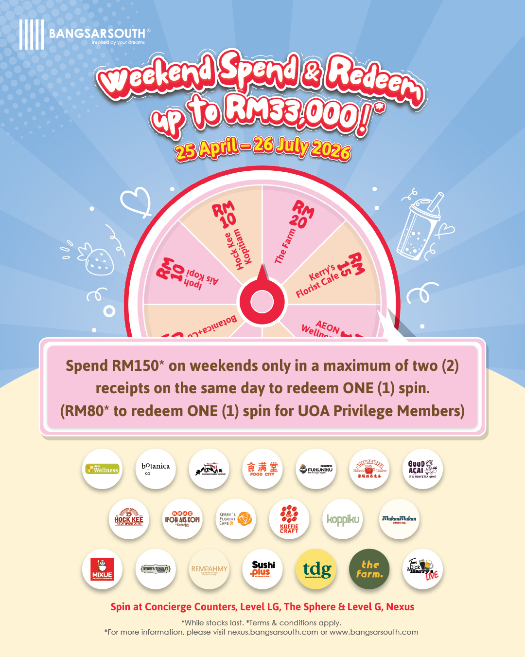 Win cash vouchers worth over RM33,000*! Redeem ONE (1) spin when you spend RM150 on weekends only (Saturday and Sunday) in a maximum of two (2) same-day receipts. (RM80* in a single receipt for UOA Privilege Members).